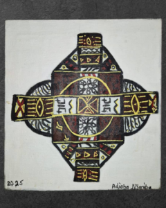 This painting portrays African royal patterns woven with ancestral signs and sacred symbols. Through bold colors and intricate motifs, it reflects power, heritage, and the spiritual language of royalty passed down through generations.